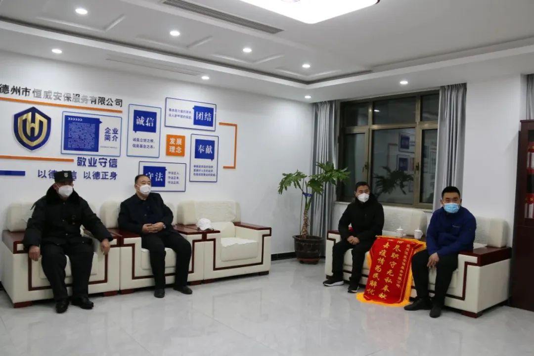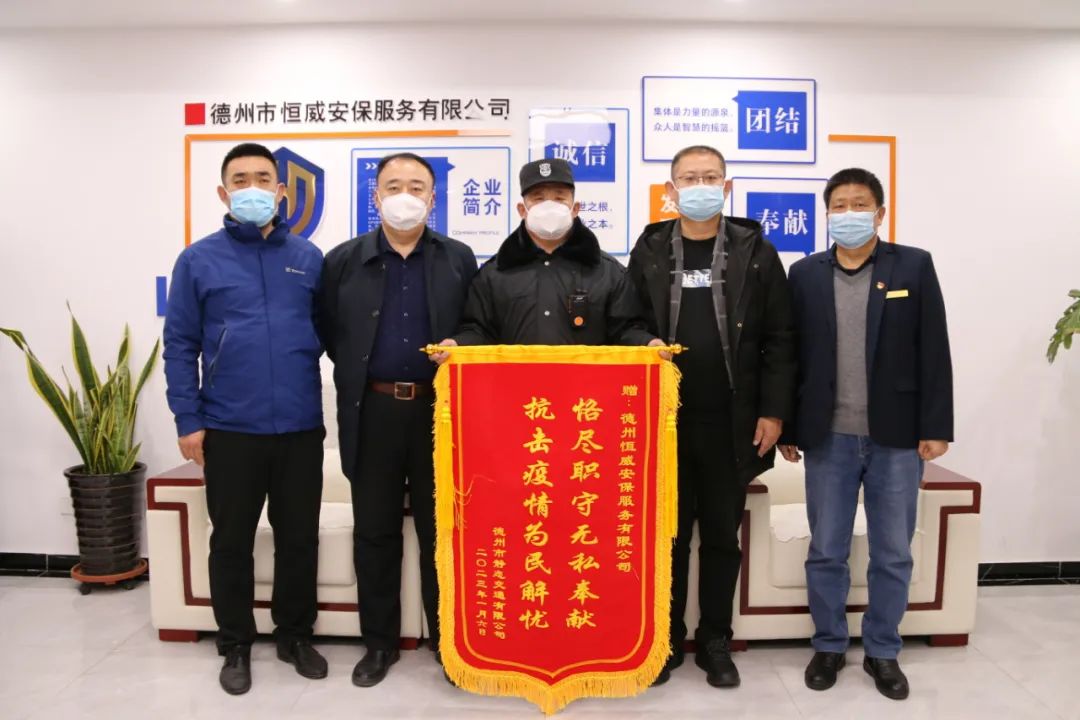 1月13日,德州市靜態(tài)交通有限公司呂強(qiáng)主任一行三人到訪德州市恒威安保有限公司,將寫有“恪盡職守?zé)o私奉獻(xiàn) 抗擊疫情為民解憂”錦旗交予恒威安保手中,公司副總經(jīng)理張玉濤、張有利,七公司大隊長高榮海參與接待。