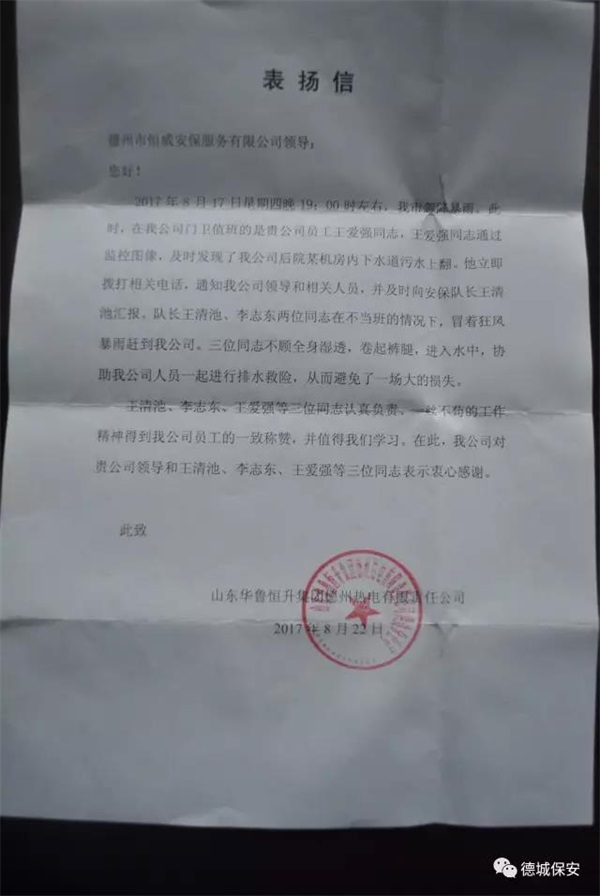 經(jīng)了解,2017年8月17日晚19時(shí)許,我市突降暴雨。人防二大隊(duì)六中隊(duì)派駐山東華魯恒升集團(tuán)德州熱電有限責(zé)任公司保安隊(duì)員王愛強(qiáng)在監(jiān)控視頻畫面中,及時(shí)發(fā)現(xiàn)客戶單位后院機(jī)房內(nèi)下水道污水上翻,且發(fā)電機(jī)組正在運(yùn)行,情況危急。他立即撥打了相關(guān)電話,通知客戶單位領(lǐng)導(dǎo)和相關(guān)人員切斷電源,并通知已下班的保安班長王清池和李志東。王清池、李志東兩名同志正在家中休息,聽到情況后,冒著大雨趕到單位,和王愛強(qiáng)一起卷起褲腿、進(jìn)入齊腰深的水中,協(xié)助客戶單位搶險(xiǎn)人員一起排水搶險(xiǎn),成功避免一場重大損失。恒升德州熱電領(lǐng)導(dǎo)得知此事后,高度重視,要求相關(guān)領(lǐng)導(dǎo)親自到恒威公司感謝相關(guān)搶險(xiǎn)人員,也為保安隊(duì)員認(rèn)真負(fù)責(zé)、愛崗敬業(yè)的作風(fēng)表示欽佩。同時(shí)對(duì)恒威公司能培養(yǎng)作風(fēng)過硬的保安隊(duì)員和提供的優(yōu)良、好的效率率的安保服務(wù)表示認(rèn)同和贊揚(yáng)。