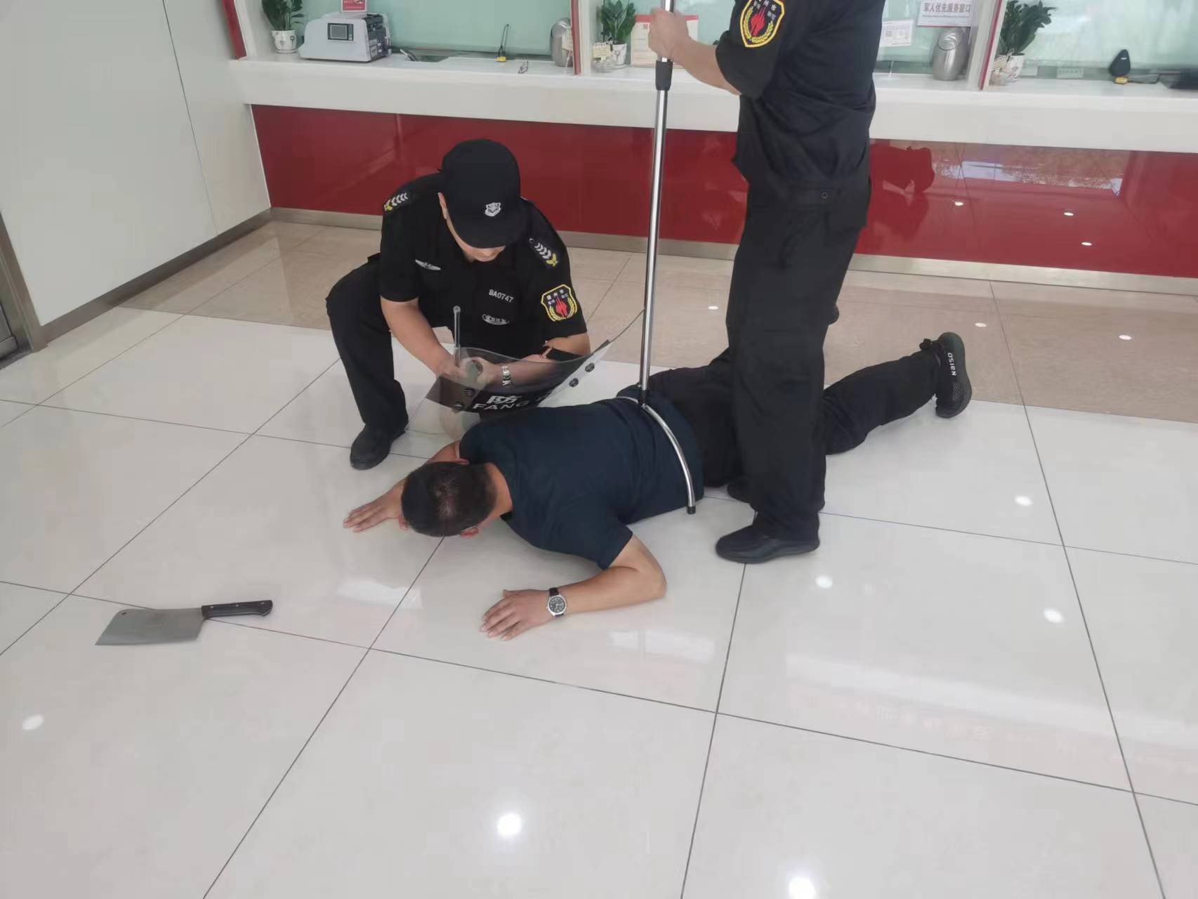 演練開(kāi)始,“歹徒”攜帶刀具沖進(jìn)營(yíng)業(yè)廳企圖傷人,危害客戶與銀行工作人員人身安全,面對(duì)“歹徒”威脅,保安隊(duì)員沉著冷靜勸說(shuō)“歹徒”,同時(shí)組織安保人員對(duì)其攔截,有序疏散人員并及時(shí)報(bào)警,最終在保安與工作人員的緊密配合下將“歹徒”成功控制,保證了人員和財(cái)物的安全。