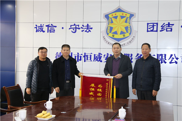 2018年11月30日上午, 德州學(xué)院保衛(wèi)處處長(zhǎng)王榮朝、副處長(zhǎng)李巖、治安科長(zhǎng)王鳳丹來(lái)我公司調(diào)研慰問(wèn)并贈(zèng)送繡有“為校園保駕護(hù)航、展恒威安保風(fēng)采”錦旗一面。