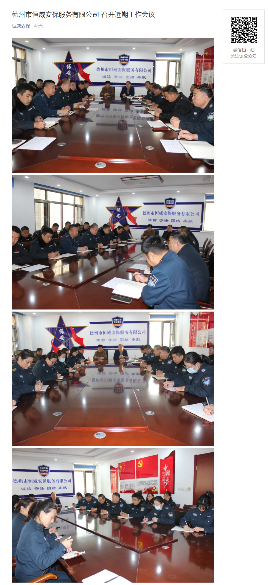 11月16日,德州市恒威安保服務有限公司召開會議,對近期工作進行安排部署。會議由公司總經(jīng)理王新衛(wèi)主持,中層以上管理人員參加。